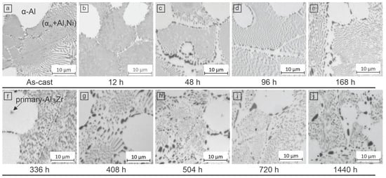 - The introduction of 0.6 wt.% Zr into the eutectic Al–Ni system leads to an increased proportion of equiaxed αAl dendrites (~30%). Aging alloy at 350 °C leads to a peak in microhardness at 92 HV0.1 after 48 h. Extended aging results in the partial coarsening of the microstructure, with the microhardness stabilizing at 75 HV0.1 after 500 h.