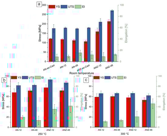 - The tensile tests of the peak-aged ANZ-48 sample revealed a significant increase in yield strength from 106 MPa to 213 MPa at room temperature. However, this increase is not retained at elevated temperatures (300 °C), where the yield strength drops to 53 MPa. The YS value is in a similar range to the alloy without Zr addition.