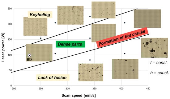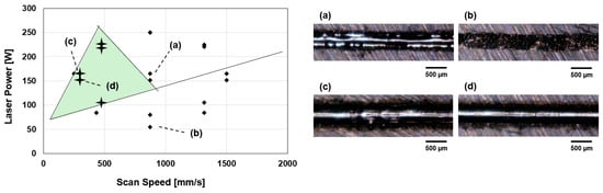 Higher scan speeds (>>875 mm/s) combined with high laser power (>>150 W) resulted in defects such as balling (Figure 3a). Energy inputs below 80 W showed virtually no melting of the metal powder, presented in Figure 3b. Laser powers between 100–225 W and scan speeds of 250–500 mm/s resulted in continuous and relatively homogeneous melt tracks (Figure 3c,d). However, the melt track in Figure 3c shows the start of inhomogeneity in the form of accumulating material. Apparently, (P = 150 W, v = 200 mm/s), this parameter set almost leads to keyholing. Figure 3d shows a homogeneous SST without any visible defect. In accordance with these results, a reduced parameter window with laser power between 84–225 W and scan speed between 250–433 mm/s is marked with a green triangle in Figure 3 and is used for the manufacturing of density cubes.