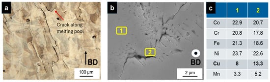 The complex temperature cycle in L-PBF with a rapid cooling rate can cause thermal residual stress in the solidification substructure, which induces cracks. To further investigate the characteristics of the printed sample, the microstructure was characterized by SEM and EDX analyses, as shown in Figure 5a,b. Intergranular and transgranular cracks were observed in the printed sample.