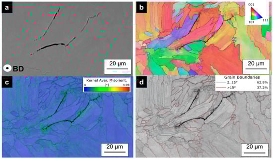 EBSD analysis revealed that several cracks formed predominantly along high-angle grain boundaries (HAGBs) in which the grains on both sides of the boundary have different orientations, as shown in Figure 6b. All cracks are distributed along grain boundaries for both columnar and equiaxed grains. Kernel average misorientation (KAM) distribution maps in Figure 6c indicated that the cracking sites displayed much higher KAM values than the other regions.