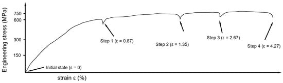 The exemplary engineering stress–strain curve, with the interruptions at the regions of interest (ROIs), is shown in Figure 7.