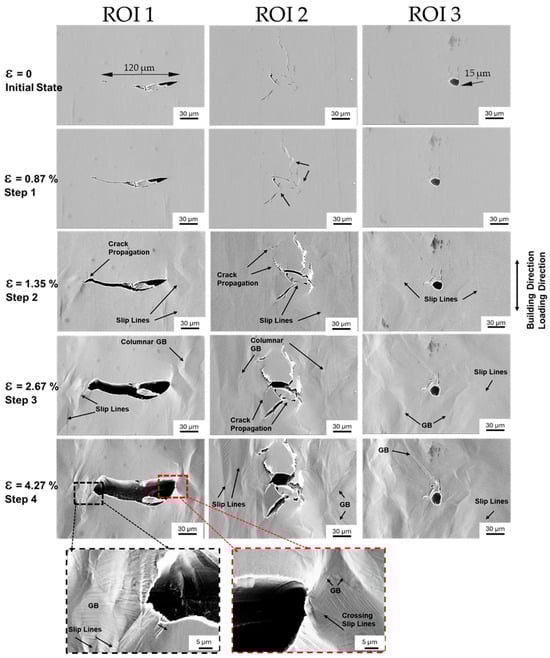 The first ROI—ROI 1—was a crack approximately 120 µm long, oriented perpendicular to the loading direction and build direction (BD). The second ROI—ROI 2—comprised a network of cracks, consisting of multiple cracks parallel to BD and with an angle of ca. 45° to BD. The third ROI—ROI 3—was a circular pore 15 µm wide, with two cracks extending in the loading direction above the pore. The initial states of all three ROIs, without tensile loading, are shown in Figure 8 (initial state).