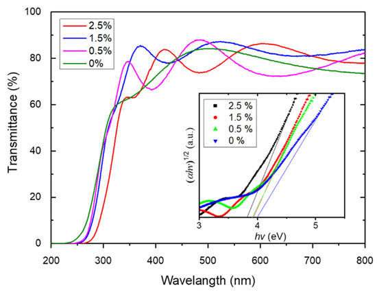 The optical transmission spectra of the samples are exhibited in Figure 3. The average transmittance of the S0–S3 samples in the visible light region is 78.8%, 77.8%, 82.7%, and 80.7%, respectively. The S4 sample appears slightly white, like frosted glass. A large surface roughness leads to an enhanced diffuse scattering of light and a reduced transmittance, which is consistent with the results of the AFM. The S2 sample shows the highest transmittance due to its high crystalline quality, large grain size, and regular lattice orientation. The Tauc formula A(hν−Eg)2 = αhν is commonly used to estimate the optical band gap of a δ-Ta2O5 film due to its indirect bandgap [39], where A is a constant, hν is the energy of the photons, Eg is the optical band gap, and α is the absorption coefficient. The inset of Figure 3 shows the curves of the (αhν)1/2 against the hν derived from the optical transmission spectra. The optical band gaps of the films doped with W concentrations of 0%, 0.5%, 1.5%, and 2.5% are 4.01, 3.93, 3.92, and 3.83 eV, respectively. It can be seen that the optical band gap of the δ-Ta2O5:W films decreases with the W doping concentrations’ increase. The decrease in Eg can be ascribed to the narrower band gap of WO3 (~2.7 eV) [40] than that of Ta2O5, similarly to Sn-doped Ga2O3 films [41].