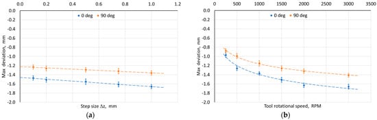In all analyzed cases, a greater deviation from the wall plane (tangent to the side edges of the drawpiece) was found for the pyramid wall, the axis of which coincided with the RD. This indicates a certain influence of the anisotropy of the workpiece properties on the final shape of the drawpiece produced using SPIF. It was found that with the increase of the step size (Figure 8a) and rotational speed (Figure 8b), the maximum deviation of the measured wall profile from the ideal profile also increased. However, the step size had a significantly smaller effect than the tool rotational speed. The increase in the wall profile deviation with the increase of the step size may be related to a smaller local deformation, and therefore a larger stress gradient in the material and higher residual stresses [51].