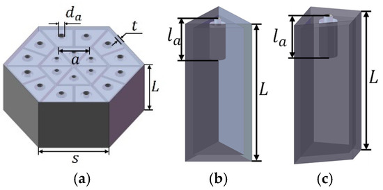The presented acoustic metamaterial features a hexagonal column divided into 18 basic unit structures, as illustrated in Figure 1a. Each unit structure can be regarded as an independent Helmholtz resonator, with an elongated aperture embedded in the center of each cavity. The triangular and right-angled trapezoidal Helmholtz resonators are presented in Figure 1b and c, respectively. This acoustic metamaterial has a compact structure and good mechanical performance. In Figure 1, the side length and total thickness of the hexagonal column are s and L, respectively; the thickness of each wall is t; the side length of the triangular resonator is a; and for each Helmholtz resonator, the length and diameter of the aperture are la and da, respectively.
