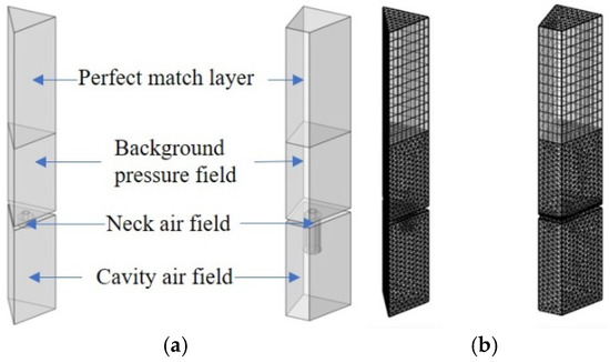 During the design of the initial acoustic metamaterial, the resonance frequencies of single cavities are classified according to the target frequency. In the structural design process, the presented acoustic metamaterial is divided into four regions. Without considering the coupling among the different cavities, the target frequency range is also divided into four frequency ranges, with one region corresponding to one frequency range. The lower the cavity resonance frequency is, the narrower the bandwidth will be. Hence, the division in the low-frequency domain is smaller than that in high-frequency regions. The volume of the triangular cavity is only 2/3 of that of the right-angled trapezoidal cavity, which means that the triangular cavity acts in the low-frequency domain at the expense of certain sound absorption bandwidth, resulting in a narrower overall sound absorption bandwidth. Therefore, to maximize the overall sound absorption bandwidth, the resonance frequencies of the right-angled trapezoidal single cavities 7–14 are in the low-frequency range, while those of the single cavities 1–6 and 15–18 are in the high-frequency range. Thus, the initial resonance frequencies of the 18 single cavities divided according to the 4 application scenarios are shown in Table 3. After the initial resonance frequencies of the 18 single cavities are determined, a FEM is established for the triangular and right-angled trapezoidal single cavities [35,36,37]. As shown in Figure 3a, the model is divided into three parts: the perfect matching layer (PML), the background pressure field (BPF), and the internal air domain. To ensure the accuracy of the finite element simulation, sweeping grids are used for meshing the PML, and free tetrahedral meshes are used to delineate the other regions, as shown in Figure 3b.