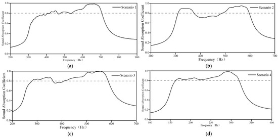 Sound-absorbing capacity of the initial acoustic metamaterial. (a) Scenario 1; (b) Scenario 2; (c) Scenario 3; and (d) Scenario 4.