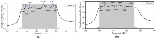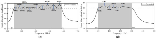 Sound-absorbing curves of the acoustic metamaterial samples. (a) Scenario 1; (b) Scenario 2; (c) Scenario 3; and (d) Scenario 4.