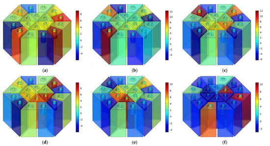 The overall resonance frequency is generated through the coupling of multiple cavities, resulting in a more comprehensive sound absorption curve. To analyze the coupling mechanism for enhancing the sound absorption of the presented acoustic metamaterials with parallel unequal cavities, the optimized acoustic metamaterial for Scenario 1 is considered as an example. The sound pressure distribution diagram at absorption peaks is selected for analysis. The results are shown in Figure 7. The operation mechanism of the presented acoustic metamaterials can be visualized in the diagram as being achieved by the coupling of cavities. When the incident sound pressure wave enters the cavity through the embedded apertures, the air particles flow at a high velocity due to the considerable difference in sound pressure amplitude near the aperture boundary, and the frictional loss leads to sound absorption. At the resonance frequency of 361 Hz, the acoustic waves are concentrated primarily in the cavities of Region 2, resulting in significant energy dissipation. At the resonance frequency points of 391 and 420 Hz, the acoustic waves are mainly concentrated in the cavities of Region 3. At the resonance frequency points of 428 and 460 Hz, the acoustic waves are mainly concentrated in the cavities in Regions 1 and 3. At the resonance frequency point of 571 Hz, the acoustic waves are mainly concentrated in the cavities of Regions 1 and 4. At the resonance frequency points of 615 Hz, 663 Hz, and 692 Hz, the acoustic waves are mainly concentrated in the cavities of Region 4.