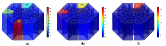 The distribution of sound pressure of optimized acoustic metamaterial for Scenario 1. (a) 361 Hz; (b) 391 Hz; (c) 402 Hz; (d) 428 Hz; (e) 460 Hz; (f) 571 Hz; (g) 615 Hz; (h) 663 Hz; and (i) 692 Hz.