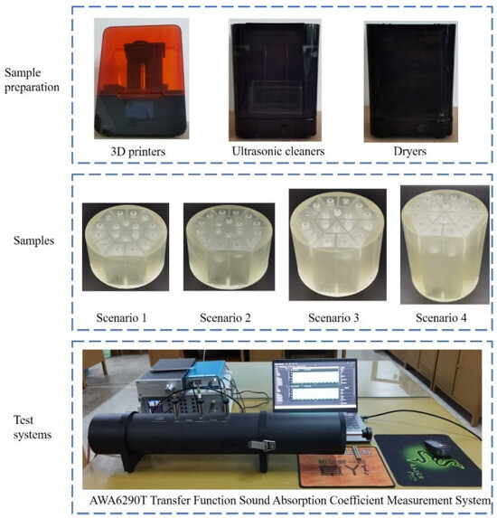 Sound absorption tests were conducted to validate the reliability of optimization results, as shown in Figure 8. The acoustic samples were manufactured by light-curing 3D printing with a low-force stereolithography 3D printer Form3 (Formlabs Inc., Summerville, MA, USA), cleansed with a Formlabs form wash (Formlabs Inc., Summerville, MA, USA), and dried with a Formlabs Form Cure (Formlabs Inc., Summerville, MA, USA). The samples were prepared as cylindrical samples with the diameter of 100 mm to suit AWA6290T transfer function absorption coefficient measurement system (Hangzhou Aihua Instruments Co., Ltd., Hangzhou, Zhejiang, China) for testing according to the national standard of GB/T 18696.2–2002 (ISO 10534–2:1998) “Acoustics–Determination of sound absorption coefficient and impedance in impedance tubes–part 2: Transfer function method” [31,32,33]. The geometry of the samples did not affect the measurement results. Acoustic absorption of samples was measured by the standing wave method. Figure 8 illustrates the experimental testing process. The prepared sample is installed in the standing wave tube of the AWA6290T system one by one, and the sound absorption coefficients in the concerned frequency ranges can be obtained automatically. For each frequency point, the average value obtained from 200 repeated tests is used as the final result, aiming to minimize random errors and uncertainties in the measurement process as much as possible. The uncertainty in this standing wave measurement process is generally characterized by the variance in multiple measurements, which the equipment manufacturer calibrates to ensure accuracy. The uncertainty of the used AWA6290T system is ±1.5%, which takes into account instrument accuracy, sample sealing performance, fluctuations in environmental conditions, the data processing method, and frequency response characteristics.