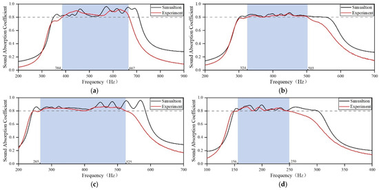 The experimental absorption coefficients for the four application scenarios of the samples obtained are shown in Figure 9. The corresponding capacity of the optimized acoustic metamaterial meets the practical application requirements, which validates the accuracy of the presented optimization method. In the actual test, the acoustic metamaterials for Scenarios 1, 2, 3, and 4 can achieve high sound-absorbing capacities in the frequency ranges of 384–667 Hz, 324–503 Hz, 265–525 Hz, and 156–250 Hz, respectively. The experimental results exhibit a fuller sound-absorbing curve due to a tighter coupling among the different cavities.