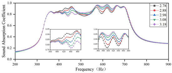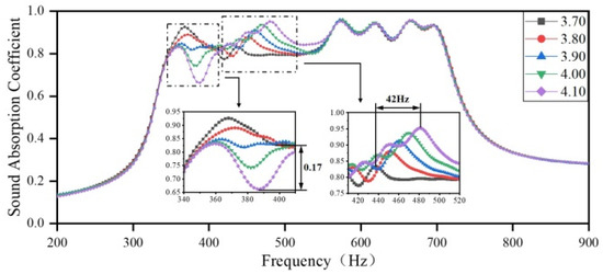 Finally, the diameters of the apertures in Region 4 are set to 3.94 mm, 4.04 mm, 4.14 mm, 4.24 mm, and 4.34 mm, respectively. The diameters of the apertures in the other three regions remain the same as those in the optimization results. The sound-absorbing curves are shown in Figure 13. As the diameter of the aperture in Region 4 increases, the sound absorption peaks in the frequency domain, ranging from 500 to 750 Hz, shift toward higher frequencies, with a maximum shift of 50 Hz. The sound absorption coefficient shows a weak variation, with a maximum difference of only 0.07. Furthermore, the coupling between Region 4 and Region 1 is weakened, resulting in a rapid decline of sound-absorbing capacity in the frequency range of 500–570 Hz and a reduced impact of the aperture diameter on the sound absorption coefficient in the high-frequency range. As the diameter of the aperture increases, the sound-absorbing band of the presented acoustic metamaterial becomes wider at the expense of the sound-absorption coefficient.
