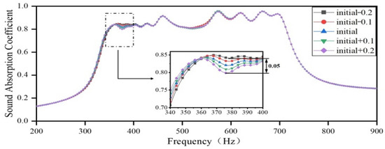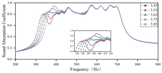 Next, the lengths of the embedded apertures in Region 2 are increased by 0.1 mm and decreased by 0.2 mm, respectively, while the lengths of the embedded apertures in the other three regions remain unchanged, as per the optimization results. The sound-absorbing curves are shown in Figure 15. As the length of the embedded aperture in Region 2 increases, the coupling between Region 2 and Region 3 is weakened, the absorption peaks in the frequency range 350–370 Hz slightly shift toward lower frequency, the sound absorption coefficient slightly decreases, and the valleys show the most significant decrease, with a maximum difference of only 0.05 in the sound absorption coefficient.