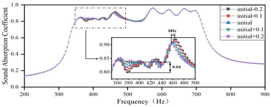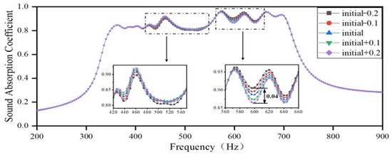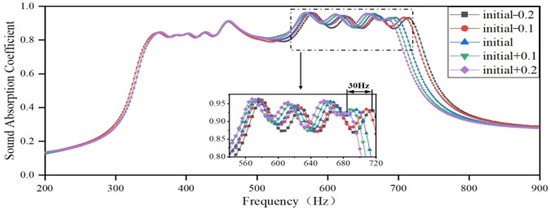 Finally, the lengths of the embedded apertures in Region 4 are increased by 0.1 mm and decreased by 0.2 mm, respectively, while the lengths of the embedded apertures in the other three regions remain unchanged, as per the optimization results. The sound-absorbing curves are shown in Figure 17. Since the length of the original embedded aperture in Region 4 is small, changing the length of the aperture in Region 4 by ±0.1 and ±0.2 mm indicates a change of ±4.5% and ± 9% concerning the original value. Hence, a slight variation in the length of the embedded aperture in Region 4 can significantly impact the sound-absorbing curve. An increase in the length of the embedded aperture in Region 4 can cause a shift in the absorption peaks toward a lower frequency, with a maximum shift of 30 Hz, a decline in the sound-absorbing capacity in the high-frequency domain, a slight reduction in the sound absorption bandwidth, and a slight improvement in the sound absorption coefficient for a low-frequency domain.