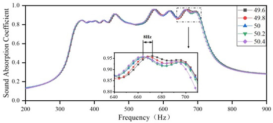 Here, the influence of a manufacturing error in the depth of the rear cavity on the sound-absorbing capacity is examined. The depths of the back cavities are set to 49.6 mm, 49.8 mm, 50 mm, 50.2 mm, and 50.4 mm, respectively. The obtained sound-absorbing curves are shown in Figure 18. As the depth of the rear cavity changes, the sound-absorbing curve of the presented acoustic metamaterial changes by 0.4% and 0.8% compared to that with the depth of the original rear cavity. The minor variation in thickness causes the overall sound-absorbing curve to shift toward low frequencies, with a maximum shift of 8 Hz. The sound absorption coefficient also changes slightly, and the difference between the curves becomes more significant as the frequency increases. This indicates that the manufacturing error in the depth of the rear cavity has a minor impact on the actual measurement results. During the design of ultra-low-frequency acoustic metamaterials, changing the cavity size is the simplest and most effective method for achieving the desired properties. However, in the practical installation process, acoustic metamaterials are mostly attached between wall plates, and the depth of the rear cavity is also limited. Therefore, adjusting other structural parameters of the metamaterial by using the optimization algorithm under the maximized size is more appropriate to meet the practical requirements.