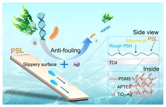 To better illustrate the design rationale, Figure 1 presents a detailed schematic of the multifunctional a multifunctional PDMS-based slippery coating (PSL) structure and its synergistic antifouling mechanisms. The coating is composed of a PDMS-based matrix modified with APTES and uniformly embedded Ag-TiO2 nanoparticles, which provide long-lasting antimicrobial activity through controlled Ag+ release. Hierarchical microtextures are introduced via laser ablation to enhance oil retention and mechanical interlocking. The infused silicone oil forms a stable lubricating layer that minimizes interfacial adhesion and enables dynamic foulant removal. According to the fabrication principle of slippery surface, low surface energy, rough structure, and oil infusion were necessary. Therefore, the subsequent sections detail the construction and evaluation of each component layer and their collective performance.