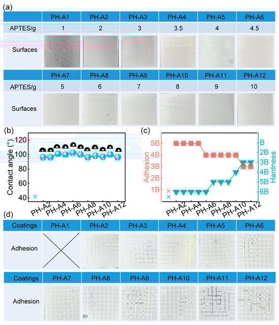 Effect of APTES content on surface wettability and mechanical properties. (a) Macroscopic appearance. (b) Static contact angle. (c) Adhesion and hardness strength of different coatings and (d) coating appearance after scratch adhesion testing.