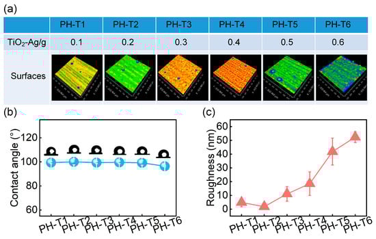 Effect of TiO2-Ag particle content on surface wettability and roughness. (a) 3D surface topography. (b) Contact angle and (c) surface roughness.