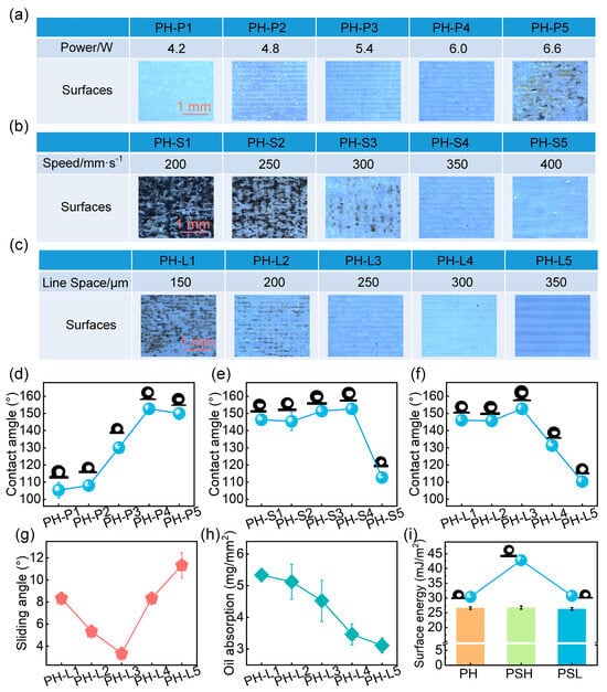 To create the hierarchical roughness required for oil retention and slippery behavior, the optimized PH coating was further modified via laser texturing. Three laser processing parameters—laser power, scan speed, and scan line spacing—were systematically investigated. Each parameter affects energy deposition and therefore determines the resulting surface morphology and wettability.