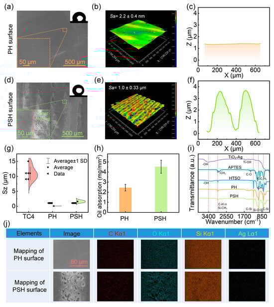 Characterization of the PH and PSH surfaces before and after laser structuring. (a) SEM image, (b) 3D surface topography, and (c) cross-sectional graphs of PH surface. (d) SEM image, (e) 3D surface topography and (f) cross-sectional graphs of PSH surface. (g) Maximum height difference (Sz) values of surface profiles. (h) Oil storage ability of PH and PSH coatings. (i) FTIR spectra and (j) elements distribution on PH and PSH surfaces.