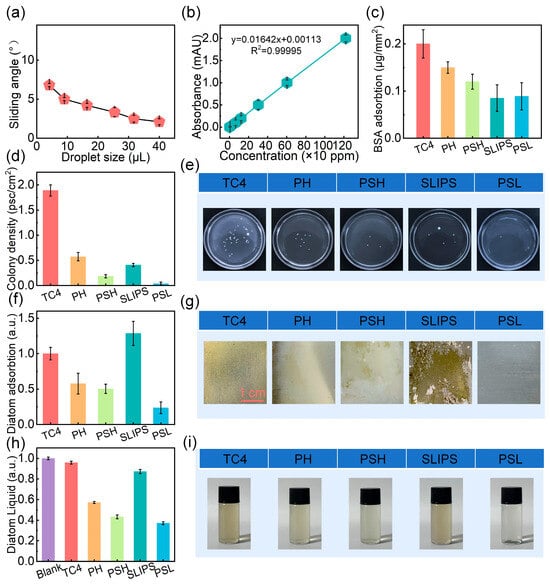 Slippery behavior and antifouling performance comparison among different surfaces. (a) Sliding angle of water droplets of different sizes on PSL surface. (b) Standard protein adsorption curve. (c) Anti-protein adhesion performance, (d,e) anti-bacterial attachment performance, and (f–i) anti-diatom performance of TC4, PH, PSH, SLIPS, and PSL surfaces.