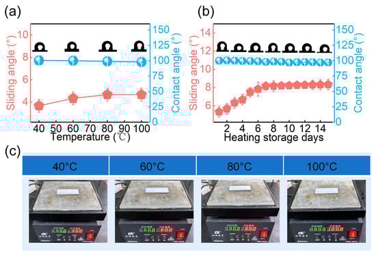 Thermal stability of the PSL coating under heating conditions. (a) Changes in contact angle and sliding angle after 30 min of heating from 40 °C to 100 °C. (b) Evolution of sliding angle and contact angle after 15 days of storage at 100 °C, and (c) digital image of heating process.