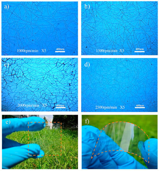 Optical microscope images (5× magnification) of Ag networks for flexible thermochromic device applications, formed from cracked acrylic colloidal dispersion at varying spin coating speeds: (a) 1000 rpm, (b) 1500 rpm, (c) 2000 rpm, and (d) 2500 rpm. Photographs in (e,f) illustrate the transparency and flexibility of the Ag micro-networks on a Polyethylene terephthalate (PET) substrate (30 × 30 mm2), with the Ag MNs highlighted by orange outlines. Reproduced with permission from ref. [28].