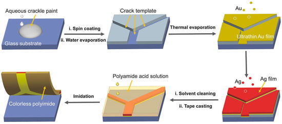 Schematic illustration of one of the possible transfer-printing techniques: fabrication process for the colorless shape memory polyimide embedded with a hybrid (Au/Ag) metal grid. Reproduced with permission from ref. [38].