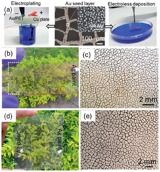 Similarly, Kang et al. [70] employed thermal evaporation (TE Ag) and subsequent EP (EP-TE Ag) to deposit Ag on glass and PET covered by cracked acrylic resin (Figure 4). The thermally evaporated Ag layer had a thickness of 350 nm, while the EP-TE Ag layer was 750 nm thick. The combined Ag mesh exhibited a transmittance ranging from 92% (TE) to 88% (EP-TE), with Rs of 5.7 Ω/sq and 1.01 Ω/sq, respectively. Notably, the EP Ag mesh showed higher optoelectronic performance, with a figure of merit (FoM, an important parameter used to describe the quality of TCE, see below) of 2827, compared to the individual TE-Ag mesh (756) and ITO film (311). Moreover, the EP Ag mesh demonstrated exceptional flexibility, maintaining stable Rs under both concave and convex bending tests, even with a small radius of curvature (<2 mm), making it ideal for flexible electronic applications such as solar cells and displays.