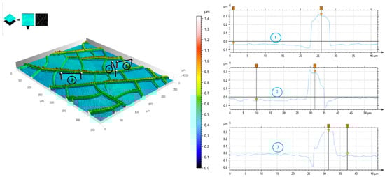 Laser scanning confocal microscope image (left) and probe profilometer thickness profile (right) of the Au mesh measured in three different test sites. Reproduced with permission from ref. [80].