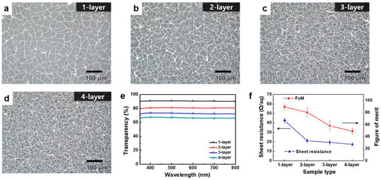 A highly interconnected Al mesh was developed by Kim et al. [58], utilizing a self-formable CT. This template, made from colloidal silica, can be easily formed and removed, while the mesh structure can be tailored by adjusting the spin-coating speed during the application of the template solution or through the stacking of multiple metal-mesh layers. These methods allow for the precise design of the Al mesh optical transparency and Rs to meet specific requirements. For the coating of the cracking material, different spin-coating speeds were used, and the entire process was repeated four times in order to obtain multiple metallic layers (results shown in Figure 7). The double-layered metal mesh system had 80% transparency and significantly reduced Rs to around 20 Ω/sq, compared to the single-layered mesh at 40 Ω/sq. Additional layers, such as triple- and quadruple-layered mesh, decreased both transparency and FoM without significantly reducing Rs further (Figure 7f). This Al-based system was investigated for potential applications in optoelectronics and solar cells, offering a promising approach for the production of flexible TCEs.