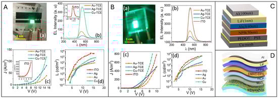 In their 2020 study, Gedda et al. [83] investigated the use of metal mesh TCEs for OLEDs. It is noteworthy that, since radiative recombination is expected to occur primarily near the gridlines, it is essential to optimize the balance between key features of the metal mesh TCE such as surface roughness, Rs, and transmission. They employed PVD to deposit, upon CT film on glass, a 50 nm thick metal layer composed of Cu, Au, or Ag, followed by the lift-off process of CT to obtain TCE. The resulting mesh electrodes exhibited a high optical transmittance of 84–87% and a Rs of 7–20 Ω/sq. Moreover, the different metal used allowed for the work function (WF) tunability of anodes. Afterward, they manufactured OLED devices with two sets of different interlayers to evaluate the impact of mesh electrodes on the performance of devices (Figure 8A,B). The first type of device (D1, see Table 3) consisted of a hole injection layer (HIL) made of N,N′-Bis(3-methyl phenyl)-N,N′-diphenyl benzidine (TPD), an emitting layer (EML) of tris(8-hydroxyquinoline)aluminum (Alq3), and a hole-blocking/electron transport layer (ETL) of 4,7-Diphenyl-1,10-phenanthroline (BPhen). These layers were grown by thermal evaporation on the Cu, Au, or Ag metal mesh anode and were capped by a LiF/Al cathode. In D1, the Cu-TCE OLED showed stronger electroluminescence (EL) than Au- and Ag-based devices. The superior performance of the Cu-TCE-based OLED can be attributed to its low Rs (7 Ω/sq) and high WF of Cu (−4.7 eV), which significantly reduces the potential barrier and facilitates efficient hole injection into the EML. However, the lower performance compared to ITO-based devices indicates other interface issues that need to be addressed. The second type of device (D2) consisted of poly(3,4-ethylenedioxythiophene) polystyrene sulfonate (PEDOT:PSS) as the HTL, and Alq3 as EML with Cu mesh and LiF/Al electrodes. The deposition of PEDOT:PSS from solution to just submerge the metal wire network, provided a smoother interface than bare TCE. The brightness of the D2 configuration was enhanced to match that of the ITO OLED, with a maximum luminance (LMAX) of 4300 cd/m2 with current efficiency (CE) of 5.38 cd/A, despite having lower transmittance. These results suggest that Cu-TCEs offer similar performance to ITO-based devices, with the added advantages of cost-effectiveness and scalability.