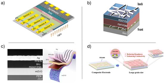 Besides the use in OLEDs discussed above, Nirmal and co-workers applied mIZVO- based TCE strategy also to OSCs [63]. Flexible OSCs with a PEN/mIZVO/PEDOT:PSS/photoactive layer/PFN-Br/Ag structure were successfully fabricated, using PM6:Y6:PC71BM as the photoactive material (Figure 9c). Under 1 sun illumination, the control device with an ITO electrode achieved a PCE of 13.17%, while the best-performing device with an mIZVO electrode achieved a PCE of 14.38%, showing enhanced performance due to the ultra-transparency and high conductivity of the mIZVO layer, together with a favorable WF alignment between IZVO and the active layer. The EQE spectra confirmed strong photoresponse in the 400–800 nm range, highlighting the potential of IZVO electrodes for efficient OSC fabrication. The possible use in both OLED and OSC technology underlines the versatility of this approach in flexible optoelectronics.