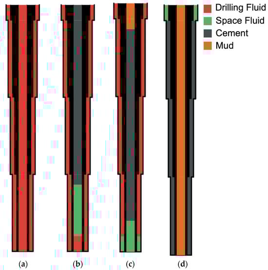Schematic of primary cementing of a new casing at different stages. (a) initial stage; (b) intermediate stage; (c) intermediate stage; (d) completion stage.