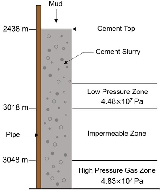 Oil well cementing is one of the critical steps in the completion of oil and gas wells in the petroleum industry. This process is accomplished by pumping cement slurries into the annulus space between the casing and the geological formation surrounding the wellbore. Oil and gas wells are drilled at different stages. At the end of each stage, cement slurry is pumped into the annulus between the wellbore walls and the new casing located inside the wellbore extending from the surface to the end of the wellbore. A schematic of the primary cementing procedure at different stages is depicted in Figure 1. Usually, cement slurries are incompatible with drilling fluids, so a spacer fluid or a chemical wash compatible with the drilling fluid and the cement slurry is pumped first to form a layer between the drilling fluid and the cement slurry [1]. The spacer fluid prevents contamination of cement slurry with mud. It also improves the cleaning and removal of debris, mud cake, and drilling fluid from the inside of the casing. The annulus and its walls provide water-wet surfaces on the casing and the formation walls to create an effective bond at the casing–cement and cement–formation interfaces [2,3,4].