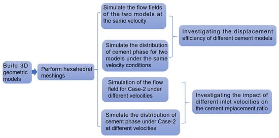 Cement is a complex multiphase material whose microstructure and interwoven chemical and physical properties pose significant challenges in establishing its constitutive model. A cement slurry, primarily composed of cement particles, water, and air, exhibits pronounced non-Newtonian characteristics, including shear-thinning effects, thixotropy, and yield stress [14]. In this study, we investigated the flow behavior of a cement slurry at different velocities to achieve effective cementing. Cement exhibits complex rheological properties, behaving as a visco-plastic or visco-elastic material in its paste form and transitioning to a nonlinear material after hardening. The most commonly used rheological models for cement paste are the Bingham model [15] and the Herschel–Bulkley model [16]. To mathematically model the flow of cement slurry at various velocities, a two-phase (or multiphase) approach can be considered. In this approach, separate constitutive relations are required for the stress tensors, and , of the cement slurry and drilling fluid, respectively. Additionally, volume fractions, and , for each phase and the interaction forces, , between them need to be taken into account. The volume-of-fluid (VOF) approach was particularly suitable for our study, as it is computationally feasible and provides a robust framework for studying the multiphase flow of cement slurry at different velocities. Therefore, in this paper, we utilized the VOF approach to computationally investigate the flow of a cement slurry for the oil well cementing process and its optimization. Figure 3 shows a schematic of the entire simulation process in this thesis.
