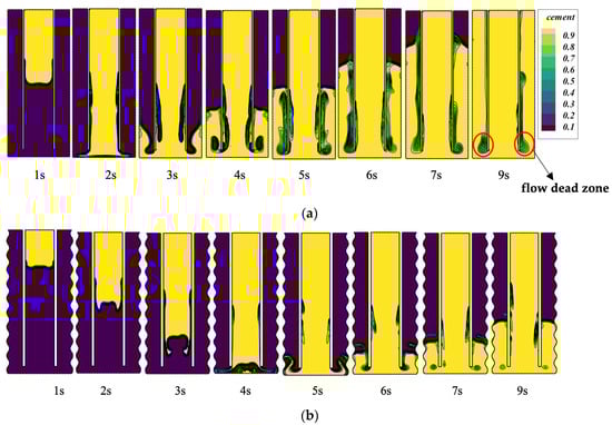 The mass fraction contours of cement at slice 2 at different times: (a) Case-1 with smooth outer wall; (b) Case-2 with irregular wall.