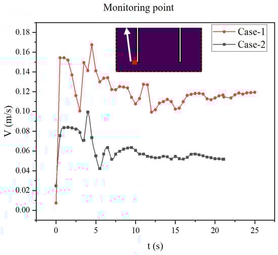 During the process of cementing for the case in which the slurry enters at 0.5 m/s from the inlet and fills the entire gap, the flow velocity at a point at the bottom of the annulus outlet is monitored. The monitoring point is located 1 mm away from the casting wall. Due to the casting wall hindering cement flow, the velocity at this point is significantly lower than the inlet velocity of 0.5 m/s. Figure 8 compares the time variation of the velocities for the two cases. It can be seen that the flow velocity increases sharply at the beginning and then fluctuates at different plateau levels. Under the same inlet velocity conditions, the annulus volume (mean cross-section area) in Case-2 with the rough wall is greater than that of Case-1 with a smooth wall. At the same inlet condition, there is a higher likelihood of forming recirculation regions at Case-1, resulting in a lower velocity at the monitoring point. As a result, the velocity at the monitoring point in Case-2 is lower than in Case-1, indicating that Case-2 is less likely to form a dead flow zone in this area. The two curves in Figure 8 have similar fluctuation trends, from which we could conclude that both cases involve the formation and destruction of recirculation regions in the annulus region.