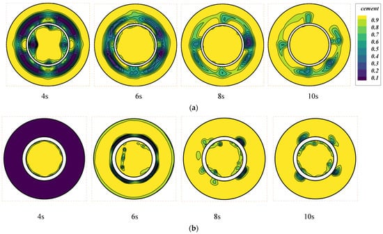 Figure 9 presents the volume fraction contours of the cement phase at slice 2 for both cases at different times. From 4 s to 10 s, the overall rate of displacement of drilling fluid by the cement slurry in Case-1 is smaller than that in Case-2 at this slice position. Comparing the situation at 6 s, the mass fraction of cement slurry on the outer wall of Case-2 is greater than in Case-1, indicating that the uniformity of the cement slurry in Case-2 is better at this time.