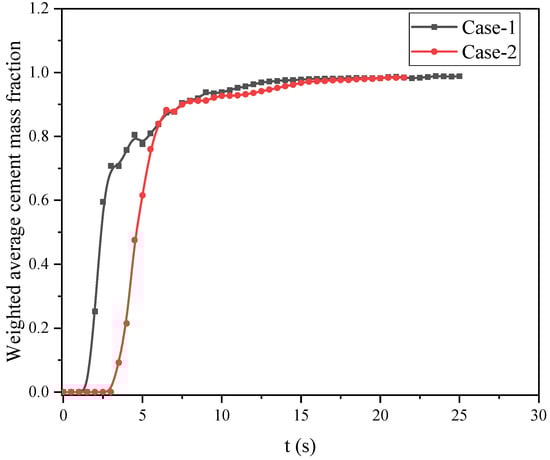 To further understand the impact of cement slurry replacing drilling fluid at slice 2, we also performed a surface-weighted average of the mass fraction of the cement phase on this slice, and the results are shown in Figure 10. We can see that from 0s to 2.5 s, the weighted average mass fractions of the cement phase on the slice for both Case-1 and Case-2 behave differently. For Case-2, the surface-weighted slurry mass average remains at zero for up to 2.5 s. It then rises sharply between 2.5 and 5 s. At 5 s, the values for both cases become the same and remain consistent afterward. However, during the period from 2.5s to 6s, the weighted mass fraction on the surface fluctuates smoothly. Notably, Case-1 exhibits a small amplitude fluctuation zone, indicating that the cement slurry and drilling fluid alternated during this time, while Case-2’s curve had no significant fluctuation during this stage, indicating that the replacement rate of the cement slurry is more uniform. After 6s, the curves of the two cases become consistent and coincide, indicating that the cement slurry has completely replaced the drilling fluid.