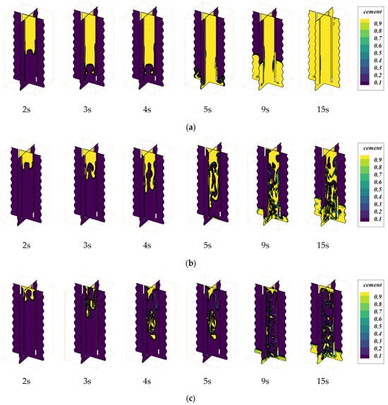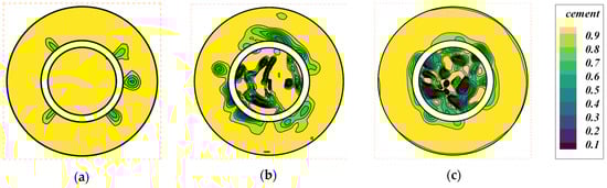 The cement phase contour at slice 2 of Case-2 at 20 s for different velocities: (a) inlet velocity: 0.5 m/s; (b) inlet velocity: 0.2 m/s; (c) inlet velocity: 0.05 m/s.