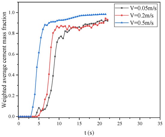 Curves of the weighted average mass fractions of cement at slice 2 versus time for different cement inlet velocities for Case-2.
