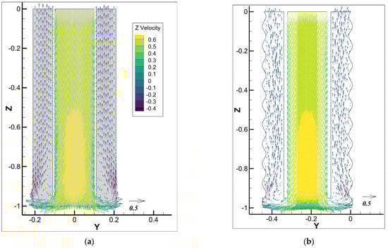 Velocity vector field colored with the mixture z-velocity for different cases for the cement slurry inlet velocity of 0.5m/s: (a) Case-1 with smooth outer wall; (b) Case-2 with irregular wall.