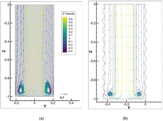 Mixture flow streamlines for different cases for the cement slurry inlet velocity of 0.5m/s: (a) Case-1 with smooth outer wall; (b) Case-2 with irregular wall.