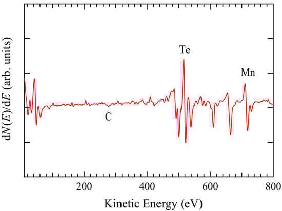 Figure 3 shows the final AES spectrum of MnTe(0001) after repeated cleaning processes. The estimated Mn and Te atomic ratio, [Te]/[Mn], is 1.02, which is nearly 1:1. Here we should mention possible carbon (C) contamination of up to 3.8%, which was estimated from a shallow dip structure at the kinetic energy of ~290 eV, corresponding to the C KLL Auger line.