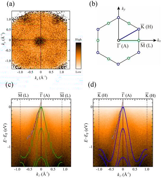 Angle-resolved/angle-integrated photoemission spectroscopy measurements have been performed on the linear undulator beamline (BL–1) of HiSOR, Hiroshima University [42,43] using a hemispherical electron-energy analyzer A-1 (MB Scientific AB, Uppsala, Sweden). The energy resolution was set at 20–50 meV. The ARPES data were taken at hν = 117 eV with the p polarization geometry. We set sample temperature at 20 K, and the base pressure of the main chamber was 3.6 × 10−9 Pa.