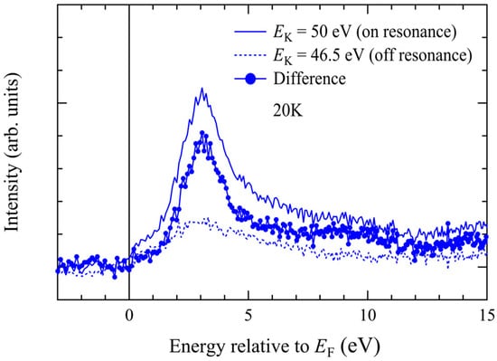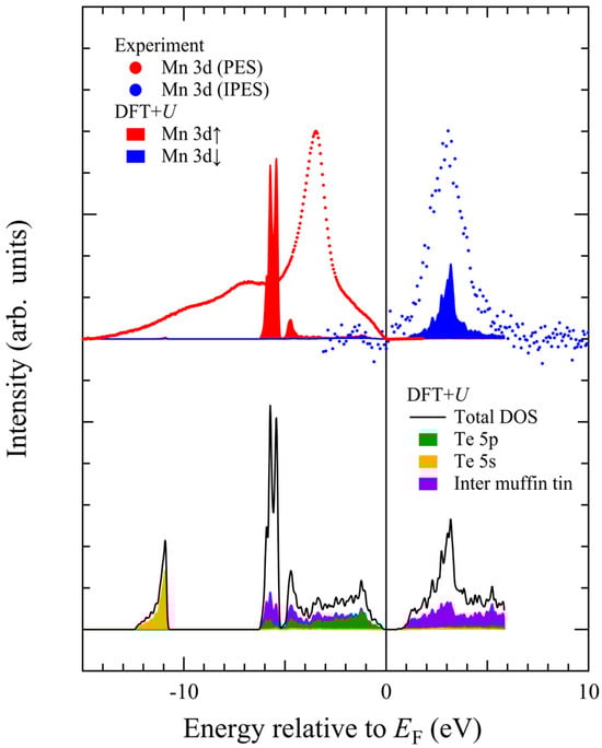 Although the photoionization cross sections of the Te 5s and Te 5p orbitals are more than one order of magnitude smaller than that of Mn 3d around hν ~ 50 eV [54], the off-resonance spectrum in Figure 6 primarily reflects these states. The Te 5s states are located around −12 eV, and the Te 5p states extend from −7 eV up to the Fermi level. These states have been more clearly identified in the X-ray photoemission spectrum [41].