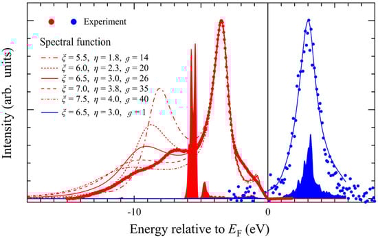 Spectral function calculated using a model self-energy. Parameter values are listed in the legend. Experimental data points (filled circles) and DFT + U results for Mn 3d↑ (red area) and Mn 3d↓ (blue area) are also shown. To account for impurity/defect scattering effects and instrumental energy resolution, energy-independent lifetime broadenings of 0.2 eV (full width at half maximum, FWHM) and 0.8 eV (FWHM) were applied to the occupied and unoccupied states, respectively.